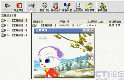 先在直播系統(tǒng)里啟動(dòng)設(shè)置好的01號(hào)頻道,其他教師就可以在各自辦公室通過(guò)計(jì)算機(jī)網(wǎng)絡(luò)觀看遠(yuǎn)教節(jié)目,不需淘神費(fèi)力地到專門(mén)的接收室了。如下圖:
