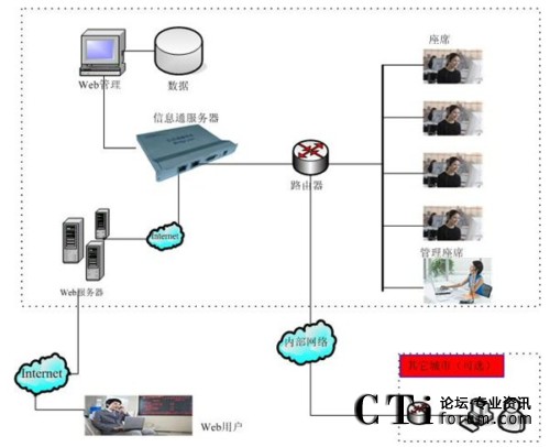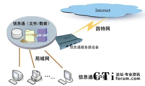 信息通系統(tǒng)的軟硬件部署,主要包括三個(gè)部分:信息通用戶工作平臺(tái)(客戶端)、信息通服務(wù)器(嵌入式設(shè)備)、數(shù)據(jù)/文件/管理服務(wù)器(其它應(yīng)用)。其中,在實(shí)際應(yīng)用中,信息通服務(wù)器與數(shù)據(jù)/文件服務(wù)器可以根據(jù)實(shí)際情況整合為一臺(tái)服務(wù)器。另外,整個(gè)系統(tǒng)通過應(yīng)用網(wǎng)關(guān)——信息通服務(wù)器設(shè)備——與Internet連接,所以,信息通服務(wù)器與應(yīng)用服務(wù)器為同一臺(tái)服務(wù)器。