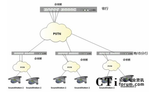 根據客戶需要在降低會議成本的前提下實現(xiàn)快速、便捷、實時的多點之間多人會議溝通的需求,我們制定了以下解決方案;系統(tǒng)利用傳統(tǒng)電話網絡,是客戶擁有自己的會議管理系統(tǒng);省行方面使用Polycom SS2基本型商務會議電話或普通模擬電話;各個市/縣級分行,根據自己會場的情況自選設備。
