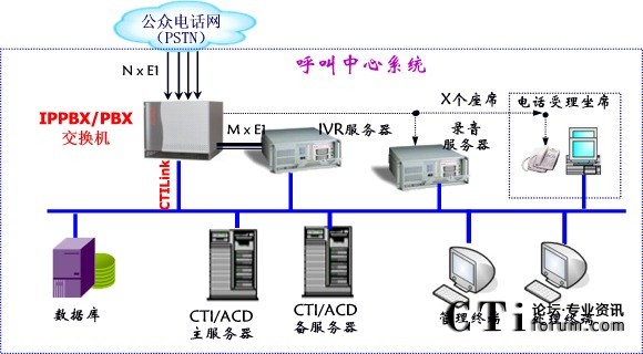 核心控制層——提供系統(tǒng)的CTI核心控制功能,負(fù)責(zé)協(xié)調(diào)各個(gè)周邊模塊的工作。還包括一個(gè)智能呼叫路由功能的ACD系統(tǒng)、自動(dòng)語音處理的IVR系統(tǒng)。