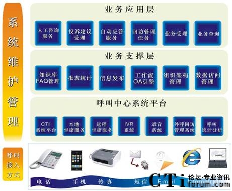 系統(tǒng)通過(guò)人工坐席、自助語(yǔ)音服務(wù)、電子郵件、傳真、即時(shí)聊天工具等方式,受理客戶所申辦的快遞業(yè)務(wù),生成派單并轉(zhuǎn)發(fā)給相應(yīng)部門進(jìn)行處理。待處理結(jié)果通過(guò)網(wǎng)絡(luò)返回到企業(yè)呼叫中心后,客服人員以電話、傳真、短信息、電子郵件等方式回復(fù)客戶。客戶也可隨時(shí)通過(guò)本系統(tǒng)了解所申辦業(yè)務(wù)現(xiàn)處于哪一環(huán)節(jié)及哪一部門所處理。系統(tǒng)的來(lái)電彈跳功能可以使客服人員第一時(shí)間獲知來(lái)電者的身份背景資料,迅速了解其歷史消費(fèi)信息、詳細(xì)地址等等資料。