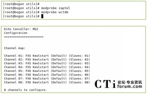 上面的輸出表示A1200P的通道都已識別,驅動安裝成功(本文用的是8個FXS口,上面的channel 01到channel 08是FXs口,后面的FXO表示它們使用的是FXO的信令,并不是表示它們是FXO口,這一點大家應該注意)
