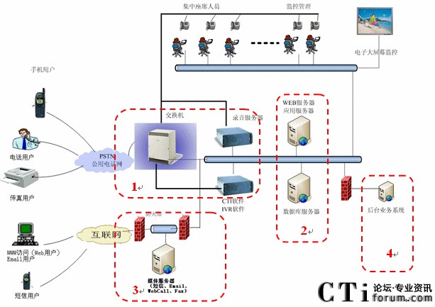 基于PBX交換機實現(xiàn)語音交換和ACD排隊、基于板卡實現(xiàn)語音資源、基于CTI中間件實現(xiàn)CallCenter功能、基于先進技術實現(xiàn)增強功能,共同搭建呼叫中心平臺。