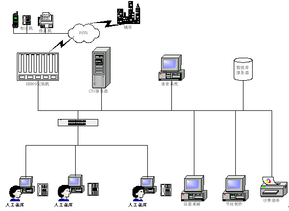 1) 數(shù)據(jù)庫系統(tǒng): 存放各類待查信息數(shù)據(jù)、話務(wù)統(tǒng)計(jì)數(shù)據(jù)、話務(wù)員操作明細(xì)數(shù)據(jù)等;