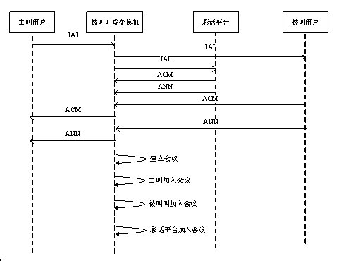 步驟6:被叫用戶端交換機(jī)產(chǎn)生會(huì)議,將主叫用戶、被叫用戶、彩話平臺(tái)加入到會(huì)議中