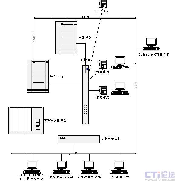 2. 設(shè)計(jì)采用一臺(tái)中繼端全程記錄HXD09交換機(jī),一臺(tái)HXD09交換機(jī)CTI服務(wù)器,一臺(tái)離線錄音服務(wù)器,一臺(tái)數(shù)據(jù)庫(kù)服務(wù)器。