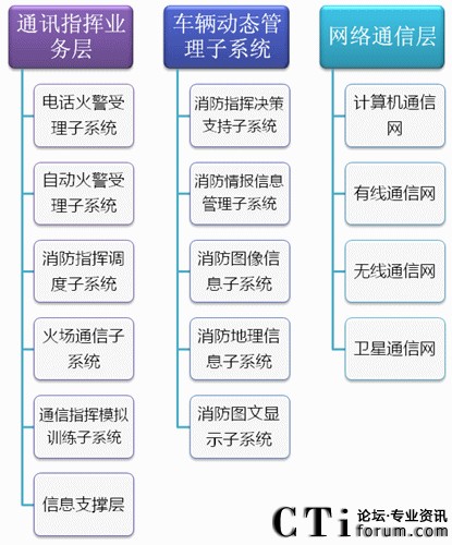 消防安全監(jiān)控指揮系統(tǒng)結(jié)構(gòu)分為三個層次:通信指揮業(yè)務(wù)層、信息支撐層、網(wǎng)絡(luò)通信層。