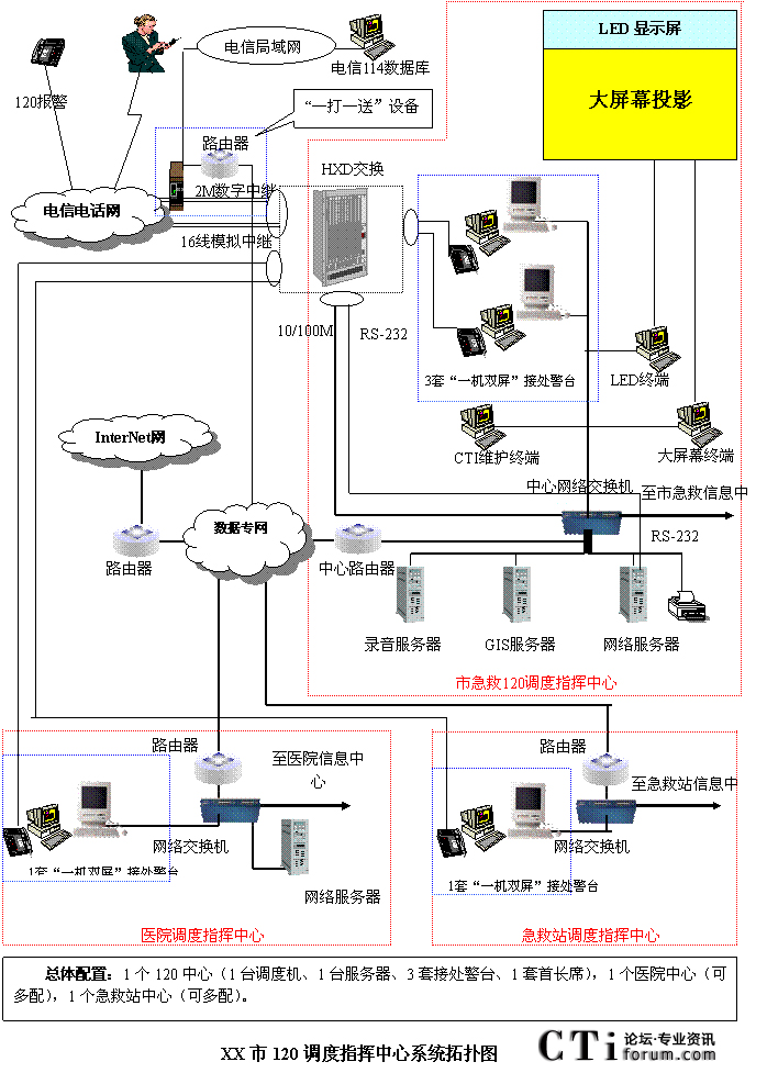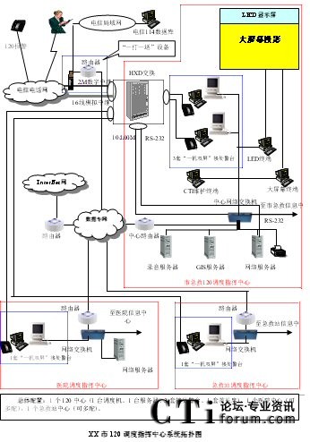 - 樹立大網(wǎng)絡(luò)概念:采用先進的通訊、計算機網(wǎng)絡(luò)技術(shù)(如CTI技術(shù)),利用現(xiàn)有的通信資源,實現(xiàn)市人民醫(yī)院120指揮中心與急救分站的計算機網(wǎng)絡(luò)及相關(guān)領(lǐng)導辦公室計算機大聯(lián)網(wǎng);形成全市范圍內(nèi)120有線、無線全方位立體調(diào)度語音通道大網(wǎng);為今后督查聯(lián)網(wǎng)、大聯(lián)動打下基礎(chǔ)。