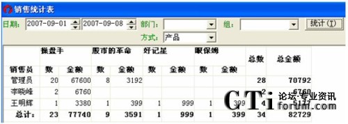 可按部門或者是方式(方式中有產(chǎn)品跟排行兩種查詢條件)來統(tǒng)計銷售信息。