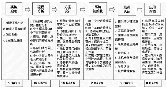 首先,組建東風(fēng)設(shè)備廠CRM實(shí)施小組,進(jìn)行項(xiàng)目動(dòng)員和CRM理念培訓(xùn)工作,使各級(jí)人員建立起"以客戶為中心"的意識(shí);然后,TurboCRM以"第三方"的身份,對(duì)業(yè)務(wù)進(jìn)行梳理,將市場(chǎng)、銷售、服務(wù)中各環(huán)節(jié)的關(guān)鍵點(diǎn)提煉出來(lái),找出隱藏的問(wèn)題,提出個(gè)性化的實(shí)施建議;結(jié)合對(duì)東風(fēng)設(shè)備廠的業(yè)務(wù)和TurboCRM系統(tǒng)的透徹理解,對(duì)市場(chǎng)、銷售和服務(wù)流程進(jìn)行重新規(guī)劃、調(diào)整、固化,形成《東風(fēng)汽車設(shè)備廠TurboCRM實(shí)施方案》文檔;與東風(fēng)設(shè)備廠CRM項(xiàng)目負(fù)責(zé)人及業(yè)務(wù)骨干員工一起建立一套協(xié)調(diào)統(tǒng)一的信息標(biāo)準(zhǔn);對(duì)東風(fēng)設(shè)備廠工作人員做全面的、有針對(duì)性的培訓(xùn),使系統(tǒng)不再是抽象的,而是"看的見(jiàn)、摸的著、用的了"的工具;最后才是系統(tǒng)的啟用和評(píng)估。這樣層層遞進(jìn),30個(gè)工作日后,