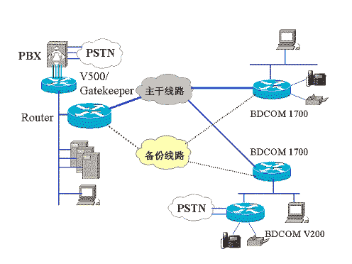 500作為Gatekeeper的Server端,V 200 作為Client端,實(shí)現(xiàn)語音和數(shù)據(jù)集成應(yīng)用。