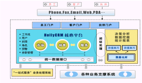 HOLLYCRM系統(tǒng)包括七大部分:HOLLYCRM核心平臺(tái)、HOLLYCRM門戶、HOLLYCRM市場(chǎng)營(yíng)銷管理分系統(tǒng)、HOLLYCRM銷售管理分系統(tǒng)、HOLLYCRM服務(wù)管理分系統(tǒng)、HOLLYCRM決策支持系統(tǒng)和"一站式服務(wù)"業(yè)務(wù)處理系統(tǒng)。其中"一站式服務(wù)"業(yè)務(wù)處理系統(tǒng)是專門為電信行業(yè)開發(fā)的后臺(tái)系統(tǒng),與前臺(tái)系統(tǒng)緊密集成。