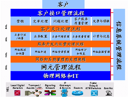Assurance)的定義是,提供量化的測(cè)量指標(biāo),確保網(wǎng)絡(luò)服務(wù)能夠達(dá)到客戶所訂購的要求。(Service Usage)的定義是,測(cè)量電信網(wǎng)絡(luò)中各種業(yè)務(wù)的使用情況,計(jì)算處理使用電信業(yè)務(wù)的應(yīng)收費(fèi)用,并對(duì)電信業(yè)務(wù)的收費(fèi)過程提供支持。這是從縱向的角度來看,而從橫向的角度來看,從電信管理的角度來看,OSS主要處在三個(gè)管理層面:客戶服務(wù)層;業(yè)務(wù)管理層;網(wǎng)絡(luò)管理層。