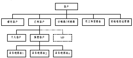 同時(shí),客戶服務(wù)中心的服務(wù)對(duì)象進(jìn)一步擴(kuò)大,按照是否已經(jīng)使用該電信運(yùn)營商提供的電信業(yè)務(wù)將客戶劃分為:潛在客戶、已有客戶。這里的潛在客戶并不針對(duì)某一具體的電信業(yè)務(wù),而是針對(duì)電信運(yùn)營商整體而言。其中,已有客戶又分為個(gè)人客戶和集團(tuán)客戶。集團(tuán)客戶內(nèi)部存在多個(gè)業(yè)務(wù)使用者,這些業(yè)務(wù)使用者本身也是客服系統(tǒng)的客戶。分銷/代理商代為發(fā)展電信運(yùn)營商的客戶,同時(shí)他們也可以單獨(dú)作為一種特殊客戶享有客服系統(tǒng)提供的服務(wù)。在個(gè)人客戶和集團(tuán)客戶中,均會(huì)有一部分成為特殊的VIP。此外,對(duì)客服系統(tǒng)來說,電信運(yùn)營商的員工和管理者也是"客戶";同時(shí),從網(wǎng)間互聯(lián)和網(wǎng)間結(jié)算的角度,其它運(yùn)營商也應(yīng)該按照客戶來對(duì)待。