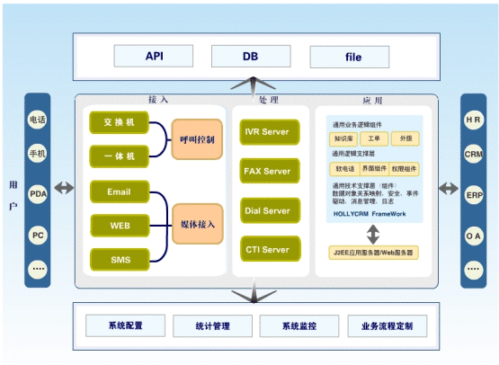 HollyC&C不僅支持電話、傳真、短信、Email、Web多媒體溝通渠道的統(tǒng)一接入和管理,還具有強(qiáng)大的業(yè)務(wù)整合接口,能夠幫助企業(yè)實(shí)現(xiàn)呼叫中心與企業(yè)其它信息系統(tǒng):如辦公OA、ERP、SCM、財(cái)務(wù)等系統(tǒng)的接口和工作流程整合。