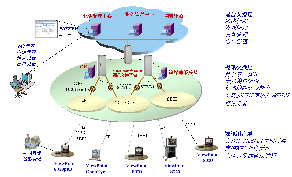 面對公眾視訊業(yè)務(wù)發(fā)展的契機,由于基于窄帶H.320的視訊系統(tǒng)較為成熟,而基于IP網(wǎng)的H.323系統(tǒng)被普遍看好,ISDN目前是最方便的公眾視訊系統(tǒng)接入手段,相對于其他接入方式(如E1、DDN、FR、ATM、IP等)使用方便,可方便通過撥號方式與任何聯(lián)網(wǎng)地區(qū)建立會議。ViewPoint 8620視訊交換平臺采用寬窄帶一體化設(shè)計,可為各行各業(yè)用戶提供完備的一體化解決方案,不僅能提供大容量ISDN用戶撥號接入,還能提供大容量的E1/V.35/IP方式接入。公眾視訊業(yè)務(wù)的發(fā)展,將視訊業(yè)務(wù)從單純?yōu)樯贁?shù)特定用戶群提供遠程會議服務(wù),轉(zhuǎn)而面向公眾,為各行各業(yè)提供視訊業(yè)務(wù)。