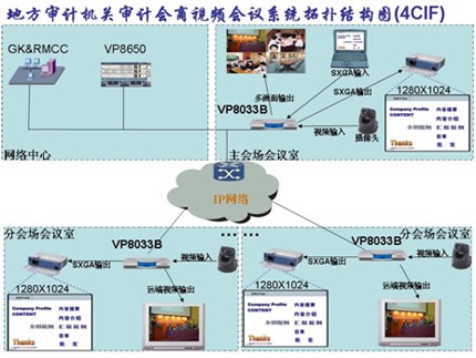 本系統(tǒng)在審計署機房配置網(wǎng)絡(luò)控制中心GK、多點資源管理系統(tǒng)和ViewPoint 8660 MCU設(shè)備。多點資源管理中心實現(xiàn)對MCU、電視會議和全網(wǎng)資源的統(tǒng)一調(diào)度,GK實現(xiàn)對IP終端入會時鑒權(quán)認證,在主會場會議室架設(shè)一臺ViewPoint 8033B分體式視訊終端。在各分會場會議室架設(shè)一臺ViewPoint 8033B分體式視訊終端;在所有會場各架設(shè)一臺標清攝像機、一個麥克風(fēng)、一臺高清電視或一臺高清投影機。