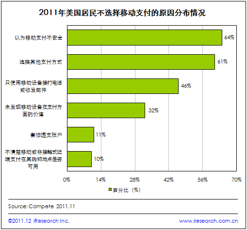 iResearch 艾瑞咨詢(xún)整理Compete 的最新數(shù)據(jù)研究發(fā)現(xiàn),在未選擇移動(dòng)支付的美國(guó)居民中,有64%的受訪(fǎng)者認(rèn)為移動(dòng)支付不安全,這成為美國(guó)居民選擇移動(dòng)支付的最大障礙。另有61%的受訪(fǎng)者表示目前仍希望使用其他支付方式,此外還有46%的居民只使用移動(dòng)設(shè)備接打電話(huà)或收發(fā)郵件。