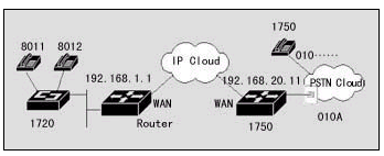 該案例中,連接到位于上海的的用戶,可以通過IP網(wǎng)絡(luò)撥打北京的PSTN用戶。位于北京的DCR 1750路由器通過 FXO接口直接連接到PSTN。假設(shè)北京可能的用戶在PSTN上的電話號(hào)碼為8位,北京的區(qū)號(hào)為010。上海的DCR 1720使用FXS端口與電話相連,北京的DCR 1750路由器使用FXO端口與PSTN上的電話端口相接,假設(shè)此端口在PSTN上的號(hào)碼為A。那么上海的用戶可以使用圖中號(hào)碼為8011(8012)的電話直接撥北京的任意電話,而北京的PSTN用戶呼叫8011(8012)電話,必須先撥號(hào)碼A,聽到二次撥號(hào)音時(shí)撥8011(8012)。在實(shí)現(xiàn)時(shí),上海的DCR 1720也可以通過器語音端口連接到PSTN,通過二次撥號(hào),使得兩地的PSTN用戶可以通過IP網(wǎng)絡(luò)互相通話,而話費(fèi)只是市話的費(fèi)用。
