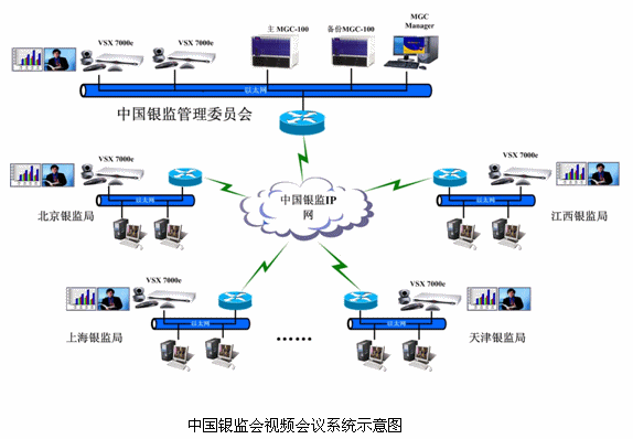 中國(guó)銀監(jiān)會(huì)目前已經(jīng)擁有一個(gè)高速、高可靠性的ATM骨干傳輸網(wǎng)絡(luò),網(wǎng)絡(luò)采用星形結(jié)構(gòu),各分支機(jī)構(gòu)到北京總部的線路均為2條15M ATM線路,這種優(yōu)良的網(wǎng)絡(luò)非常適合視頻會(huì)議業(yè)務(wù)的運(yùn)營(yíng)。視頻會(huì)議網(wǎng)建立完成后可以實(shí)現(xiàn)通過遠(yuǎn)程視頻會(huì)議,遠(yuǎn)程處理重點(diǎn)銀行業(yè)金融機(jī)構(gòu)監(jiān)事會(huì)的日常管理工作;遠(yuǎn)程審查銀行業(yè)金融機(jī)構(gòu)高級(jí)管理人員任職資格;遠(yuǎn)程討論協(xié)商制定有關(guān)銀行業(yè)金融機(jī)構(gòu)監(jiān)管的規(guī)章制度和辦法;遠(yuǎn)程對(duì)銀行業(yè)金融機(jī)構(gòu)實(shí)監(jiān)管,依法對(duì)違法違規(guī)行為進(jìn)行查處;更加可以通過遠(yuǎn)程雙流會(huì)議,按照國(guó)家有關(guān)規(guī)定,遠(yuǎn)程公布全國(guó)銀行數(shù)據(jù)、報(bào)表。