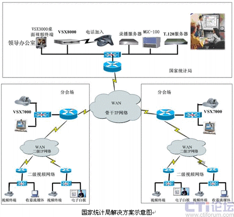 為確保如此巨大的視頻會(huì)議系統(tǒng)的應(yīng)用效果,視頻會(huì)議系統(tǒng)的各個(gè)設(shè)備全部采用POLYCOM公司的產(chǎn)品。寶利通(POLYCOM)公司依靠自身豐富的經(jīng)驗(yàn)、領(lǐng)先的產(chǎn)品和技術(shù)以及豐富的項(xiàng)目部署經(jīng)驗(yàn),結(jié)合國(guó)家統(tǒng)計(jì)局的實(shí)際需求,提出了全套的視頻會(huì)議系統(tǒng)解決方案,并最終憑借產(chǎn)品出色的視音頻質(zhì)量、良好的穩(wěn)定性和先進(jìn)的技術(shù)、以及出色的服務(wù)贏得了用戶的認(rèn)可,成功中標(biāo)國(guó)家統(tǒng)計(jì)局視頻會(huì)議系統(tǒng)項(xiàng)目.該系統(tǒng)可最大限度地發(fā)揮其現(xiàn)有IP寬帶網(wǎng)絡(luò)的優(yōu)勢(shì),加快對(duì)具體事件的處理速度,節(jié)約辦事人員的路途時(shí)間,最大限度地提高政府的辦公效率,降低辦公費(fèi)用。