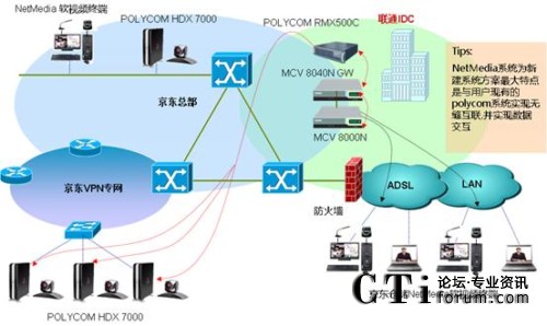 京東商城各地倉儲分布在全國各大中小城市,跨地域性強,且各倉儲點的網(wǎng)絡的供應商不盡相同,企業(yè)廣域網(wǎng)的多運營商線路租用,充分考慮到承載系統(tǒng)的網(wǎng)絡復雜性和不穩(wěn)定性,這就要求該系統(tǒng)能在低帶寬、網(wǎng)絡延時、抖動等復雜互聯(lián)網(wǎng)網(wǎng)絡上實現(xiàn)低延時、高保真的音視頻通信和數(shù)據(jù)交互。捷視飛通根據(jù)京東客戶的需求和用戶的客觀網(wǎng)絡情況,提供了一套大容量、廣覆蓋的軟硬結(jié)合解決方案,該方案不但滿足用戶本次的與H.323融合的、系統(tǒng)擴容的需要,還充分考慮了系統(tǒng)未來的擴容性,目前該系統(tǒng)已成功在京東各區(qū)倉儲部署和應用。
