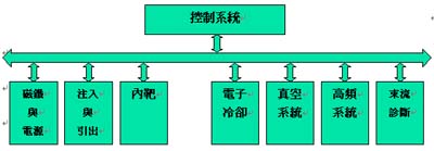 同步輻射設備以系統分類可分為磁鐵系統、電源系統、高頻系統、注入與引出系統、電子冷卻系統、內靶系統、真空系統、束流診斷系統、控制系統、準直與測量系統。系統架構圖如下: