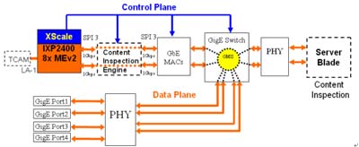 Inspection),表頭辨識系針對其流向、連結、輸入端口及目的地址等做比對;內(nèi)容檢查則有復雜的算法,處理頻寬及內(nèi)存容量需求極高,很顯然內(nèi)容檢查即將是此系統(tǒng)非常嚴重的交通瓶頸所在,這個運算將耗用大量IXP-2400網(wǎng)絡處理器的運算資源。因此必須采用另一個處理器卸載此運算,有兩種方法可行,其一是如圖四:加入一顆個可程序內(nèi)容檢查引擎(Programmable