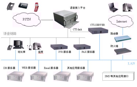 基本部分是呼叫中心的必要組成部分。基本部分包括:智能網(wǎng)絡(luò)(IN)、自動(dòng)呼叫分配設(shè)備(ACD)、交互式語音應(yīng)答系統(tǒng)(IVR)、CTI服務(wù)器、人工座席、數(shù)據(jù)庫服務(wù)器、管理平臺(tái)等;擴(kuò)展部分是隨著呼叫中心技術(shù)的發(fā)展而逐漸豐富的,擴(kuò)展部分目前主要包括:Web服務(wù)器、Email服務(wù)器、傳真服務(wù)器、IP電話網(wǎng)關(guān)等。系統(tǒng)結(jié)構(gòu)如下圖所示:
