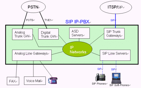 MOSA的SIP IP-PBX是一個完整的商用交換機系統(tǒng),能提供企業(yè)完整的通信服務(wù),因應(yīng)各種不同接口的連結(jié)需求,例如公眾電信系統(tǒng)(PSTN)、SIP服務(wù)商、傳真機、電話機、語音信箱、SIP IP Phone、SIP Soft-phone、Wifi-Phone以及各種SIP終端設(shè)備等等,MOSA的SIP IP-PBX提供模塊化的接口連接設(shè)備,每一種接口連接設(shè)備均配備有以太網(wǎng)絡(luò)接口,可以透過IP網(wǎng)絡(luò)相互連結(jié),使得各分公司之間通信零距離。MOSA SIP IP-PBX除了解決基本的接口連接外,也提供各式各樣的應(yīng)用服務(wù)服務(wù)器(Application Service Devices),增進整體系統(tǒng)的功能,譬如:網(wǎng)絡(luò)型電話會議,網(wǎng)絡(luò)型廣播,移動辦公功能等。