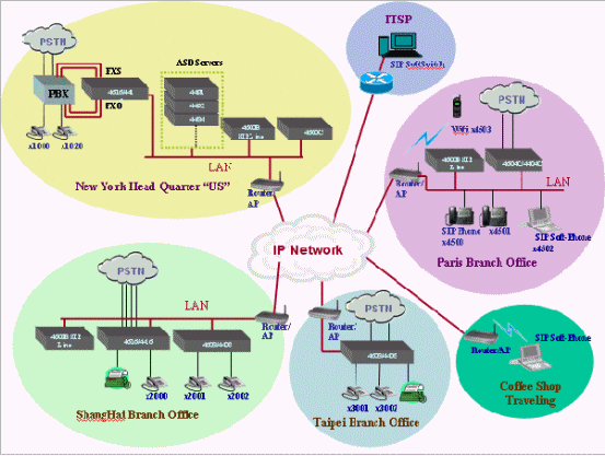 一公司總部設(shè)在美國,在上海、巴黎、臺北設(shè)有分公司,使用MOSA 4616、MOSA 4608等設(shè)備提供全公司使用虛擬號碼、會議電話以及廣播系統(tǒng),除此之外還裝設(shè)了MOSA 4600B SIP Line提供外出公干的同仁們可以利用手提電腦上面的軟件電話透過網(wǎng)際網(wǎng)絡(luò)和總公司的同仁聯(lián)絡(luò)。