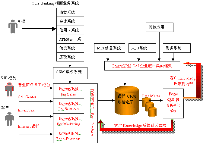 利用PowerCRM的銀行分析型CRM解決方案,對(duì)客戶信息進(jìn)行全面的分析,從而挖掘出許多客戶知識(shí),繼而制定和改進(jìn)相應(yīng)的市場(chǎng)策略,應(yīng)用于PowerCRM運(yùn)營型CRM系統(tǒng)中,更好地指導(dǎo)營銷人員為客戶服務(wù)和完善客戶服務(wù)流程;同時(shí)也需要反饋到銀行內(nèi)部系統(tǒng),用于增強(qiáng)銀行內(nèi)部的運(yùn)營效率。