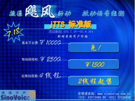 2003年7月18日,北京捷通華聲語音技術(shù)有限公司正式發(fā)布捷通華聲語音合成技術(shù) “jTTS標(biāo)準(zhǔn)版”。為慶!癹TTS標(biāo)準(zhǔn)版”的正式上市,為期近三個(gè)月,推廣“jTTS標(biāo)準(zhǔn)版”的捷通“颶風(fēng)行動(dòng)”也在同一時(shí)間正式啟動(dòng)! 捷通“颶風(fēng)行動(dòng)”的宗旨--用全新的產(chǎn)品、全方位的服務(wù)、最具競爭力的價(jià)格與所有CTI領(lǐng)域的企業(yè)合作,開啟面向中小型CTI系統(tǒng)語音應(yīng)用的市場大門,為CTI產(chǎn)業(yè)發(fā)展提供持久動(dòng)力支持!