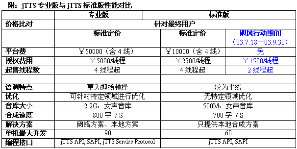 1)為"jTTS標(biāo)準(zhǔn)版"提供進(jìn)一步的優(yōu)惠價(jià)格。(詳情請(qǐng)聯(lián)系捷通市場營銷中心)