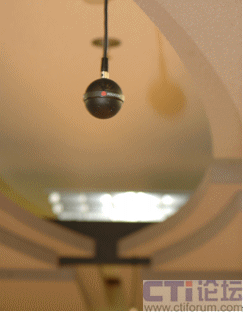 至關(guān)重要的麥克風(fēng)并沒有放在桌子上,而是像小行星一樣巧妙地懸掛于天花,徹底改變了人們對著麥克風(fēng)發(fā)言的習(xí)慣,讓溝通更趨向于真實(shí)會(huì)議環(huán)境;可別小看這“高高在上”的麥克風(fēng),它的360度全向立體聲拾音能力,震撼了我們在座的每一個(gè)人,寬帶音頻技術(shù)已經(jīng)到了如斯的地步。