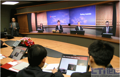 我們參與體驗(yàn)的8個(gè)人在面向屏幕的一側(cè)坐下,寶利通技術(shù)人員在位于會(huì)議桌正中的觸摸屏上輕輕點(diǎn)了一下,對面瞬間出現(xiàn)了4張微笑的面孔,整個(gè)畫面的色彩和亮度都非常柔和,感覺對面的座位突然間被坐滿了。技術(shù)人員介紹說我們已經(jīng)和澳大利亞辦公室接通了,我仔細(xì)觀察才發(fā)現(xiàn),除了背景墻上的“Sydney,