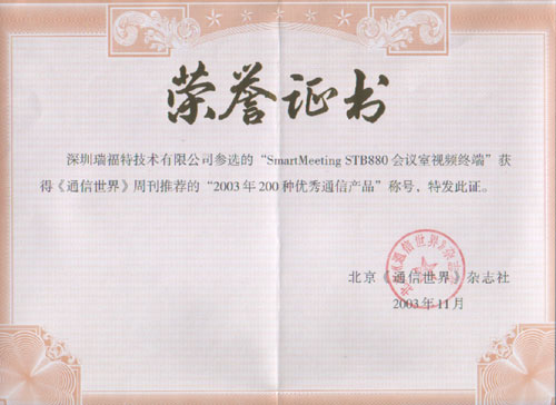 2003年是視頻會議突飛猛進(jìn)的一年,今年11月由北京《通信世界》雜志社主辦的"2003年200種優(yōu)秀通信產(chǎn)品"評選活動已經(jīng)揭曉,深圳市瑞福特信息技術(shù)有限公司的SmartMeeting STB880會議室視頻終端獲得此榮譽(yù)稱號。