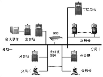 在每個分局和信息中心機(jī)房設(shè)置分會場,實現(xiàn)網(wǎng)絡(luò)視頻會議和遠(yuǎn)程技術(shù)支持。分會場的會議終端設(shè)備選用VCON的會議室型柜式終端MediaConnect
