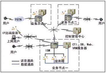 每個業(yè)務節(jié)點都由ISM(智能交換模塊)、CTI服務器、DB(數(shù)據(jù)庫)、VRM(語音資源模塊)和座席等模塊構成,下面逐一介紹各模塊的作用和功能。