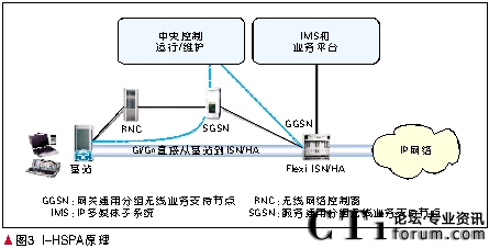 Mb/s為例,一個1 500個扇區(qū)的HSDPA網(wǎng)絡(luò)所產(chǎn)生的數(shù)據(jù)量為21.6 Gb/s。目前業(yè)界RNC的數(shù)據(jù)吞吐量僅達(dá)到1 Gb/s。今天各運(yùn)營商建設(shè)的3G網(wǎng)絡(luò)與2G共用核心網(wǎng),其帶寬和數(shù)據(jù)處理能力遠(yuǎn)遠(yuǎn)不能滿足HSPA高數(shù)據(jù)率的需求。當(dāng)數(shù)據(jù)負(fù)荷激增時運(yùn)營商將面對RNC/SGSN的擴(kuò)容的巨大壓力。此外在每一個節(jié)點處對數(shù)據(jù)包的重新拆裝會導(dǎo)致在每一節(jié)點都要引入額外的時延。結(jié)果會產(chǎn)生較長的網(wǎng)絡(luò)時延。對于移動互聯(lián)網(wǎng)應(yīng)用,這種多層次的網(wǎng)絡(luò)結(jié)構(gòu)是沒有必要的。使網(wǎng)絡(luò)扁平化不僅可以簡化設(shè)備降低成本,還可以減少時延。I-HSPA應(yīng)運(yùn)而生。這種架構(gòu)把基站通過Gi/Gn口直接連接到GGSN節(jié)點(通向互聯(lián)網(wǎng)和數(shù)據(jù)業(yè)務(wù)的網(wǎng)關(guān))[5]。I-HSPA原理如圖3所示。