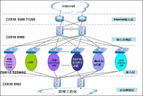 寬帶數(shù)據(jù)承載網(wǎng)主要考慮的是保證網(wǎng)絡(luò)的高可靠性(整體網(wǎng)絡(luò)結(jié)構(gòu)全冗余和設(shè)備的全冗余配置)、高可擴展性(核心交換設(shè)備具有大容量特性和網(wǎng)絡(luò)結(jié)構(gòu)的易于拓展)、分層網(wǎng)絡(luò)結(jié)構(gòu)和高可用性。中興的解決方案中,整個網(wǎng)絡(luò)分成四個部分:Internet接入層、核心交換層、接入層、后臺管理區(qū)。