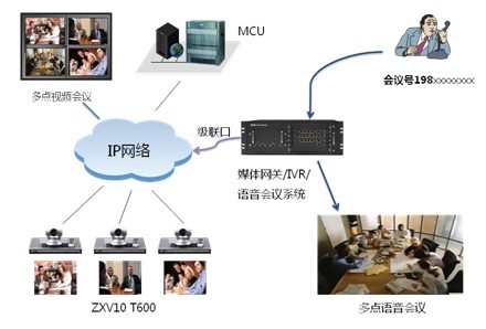 在現(xiàn)有視頻會議網(wǎng)絡(luò)基礎(chǔ)上新增語音網(wǎng)關(guān)設(shè)備,主要負(fù)責(zé)PSTN、移動網(wǎng)和IP網(wǎng)絡(luò)的信令轉(zhuǎn)接、音頻編碼的轉(zhuǎn)換、多點(diǎn)純語音會議、IVR會議引導(dǎo)。