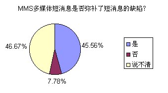 問(wèn)卷的調(diào)查結(jié)果有些屬于意料之中,有些則暫一定程度上給運(yùn)營(yíng)商和終端提供上潑了冷水。不過(guò),有一點(diǎn)是讓提供移動(dòng)服務(wù)的企業(yè)感到欣慰和滿意的,那就是:最終用戶對(duì)MMS的接受程度相當(dāng)高,除去對(duì)資費(fèi)、操作的質(zhì)疑外,幾乎90%以上的用戶都認(rèn)為MMS廣泛流行是一個(gè)必然的趨勢(shì)。下面我們就讀者們廣泛關(guān)注的問(wèn)題來(lái)研究一下。