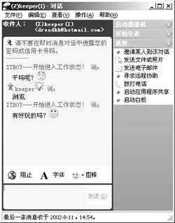 聊天功能是IM軟件最基本、也是最重要的功能,基本上每一種IM軟件在這個功能上的操作都差不多:如果用戶想與聯(lián)系人進(jìn)行聊天,可以雙擊IM中聯(lián)系人的頭像,在彈出的對話框中敲入文字信息發(fā)送即可。QQ的特點是可以給不在線的朋友發(fā)送信息,對方下次上線的時候可以收到,MSN雖然不具備這樣的功能,但是它在聊天過程中可以使用各種漂亮的表情圖標(biāo)為聊天添加了不少情趣。