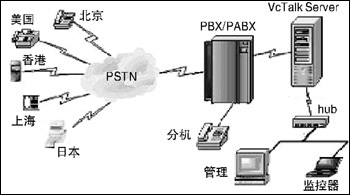 用語(yǔ)音板卡搭建電話(huà)會(huì)議一般注重在單一的音頻通信。考慮到單純的音頻或視頻會(huì)議模式都或多或少有各自的局限性,宇音將數(shù)據(jù)與語(yǔ)音整合在一起,實(shí)現(xiàn)音頻/圖文會(huì)議。VCTalk各系列電話(huà)會(huì)議系統(tǒng)采用高性能的語(yǔ)音/會(huì)議資源卡作為硬件支持,可實(shí)現(xiàn)多方電話(huà)會(huì)議(≥8),具有多組會(huì)議、與會(huì)者身份認(rèn)證、設(shè)置會(huì)議主持人、邀請(qǐng)與會(huì)者、會(huì)議通知、會(huì)議內(nèi)容同步播放、會(huì)議密碼保護(hù)、智能播放、會(huì)議內(nèi)容全程錄音/存儲(chǔ)、本地/遠(yuǎn)程查聽(tīng)會(huì)議錄音的功能,并可以對(duì)企業(yè)內(nèi)部發(fā)生的呼叫記錄進(jìn)行計(jì)費(fèi)和統(tǒng)計(jì)。針對(duì)中小企業(yè)辦公靈活的特點(diǎn),VCTalk系統(tǒng)搭建簡(jiǎn)單易行,其結(jié)構(gòu)圖見(jiàn)圖1。