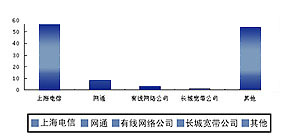 在國內(nèi),視訊市場的形成已經(jīng)初露端倪,眾多商家都開始瞄準(zhǔn)這個新的利潤增長點(diǎn)。2002年8月,上海電信正式將視訊業(yè)務(wù)命名為“新視通”,并陸續(xù)開通了上海至美國洛杉磯、新疆烏魯木齊、石河子、克拉瑪依等地區(qū)的公眾視訊業(yè)務(wù),同時還針對商用客戶和個人用戶啟動了推廣計劃。由于上海是我國的貿(mào)易、金融、經(jīng)濟(jì)中心,許多國內(nèi)外的大型企業(yè)都在上海設(shè)有分支機(jī)構(gòu),市場潛力不可估量,眾多運(yùn)營商都在爭取上海的市場。目前,除了上海電信推出的“新視通”業(yè)務(wù)外,網(wǎng)通、有線網(wǎng)絡(luò)和其它公司都在上海推出了自己的視訊系統(tǒng)。根據(jù)我們對企業(yè)用戶的抽樣調(diào)查,下圖的市場占有率表明了視訊業(yè)務(wù)的競爭將會日益激烈。