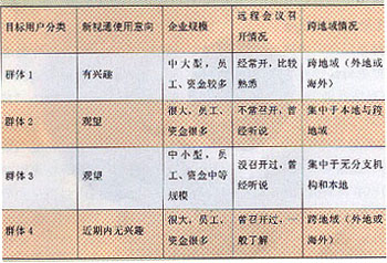 根據(jù)前一階段我們做的視訊業(yè)務(wù)市場研究,目前的主要目標(biāo)客戶可以定位為以下范圍:對于“新視通”會議系統(tǒng)感興趣的客戶,需要觀望的客戶以及雖然不感興趣但企業(yè)規(guī)模較大、存在著一定會議需求卻對遠(yuǎn)程會議不了解的客戶。通過對目標(biāo)群體的進(jìn)一步細(xì)分,我們將客戶聚類為四個主要群體:
