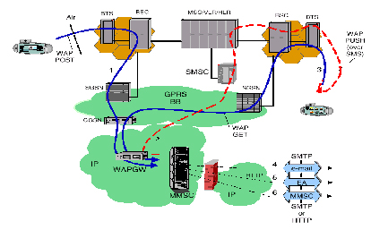 ·圖中第一條消息流顯示了多媒體消息由BTS、BSC、SGSN和GGSN到達IP網(wǎng)絡,通過WAP Gateway被轉(zhuǎn)發(fā)到MMSC中。