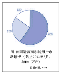 彩鈴業(yè)務最先是由韓國的SK電信于2002年3月推出的,業(yè)務一經面世就吸引了移動用戶、特別是年青用戶群體的眼球,開通的用戶數和業(yè)務使用率呈指數式增長;同時由彩鈴業(yè)務帶來的互聯(lián)網、WAP和IVR的話務量的增長進一步提升了彩鈴業(yè)務的含金量。隨后韓國的其他兩個移動運營商LG電信和韓國電信也分別于2002年6月和9月相繼開通彩鈴業(yè)務。經過運營商和彩鈴的內容提供商的前期市場推廣和運作,目前已發(fā)展了近1000萬用戶,其中運營商的市場份額如圖所示。