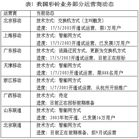 表1總結了目前我國部分運營商彩鈴業(yè)務的發(fā)展動態(tài)。